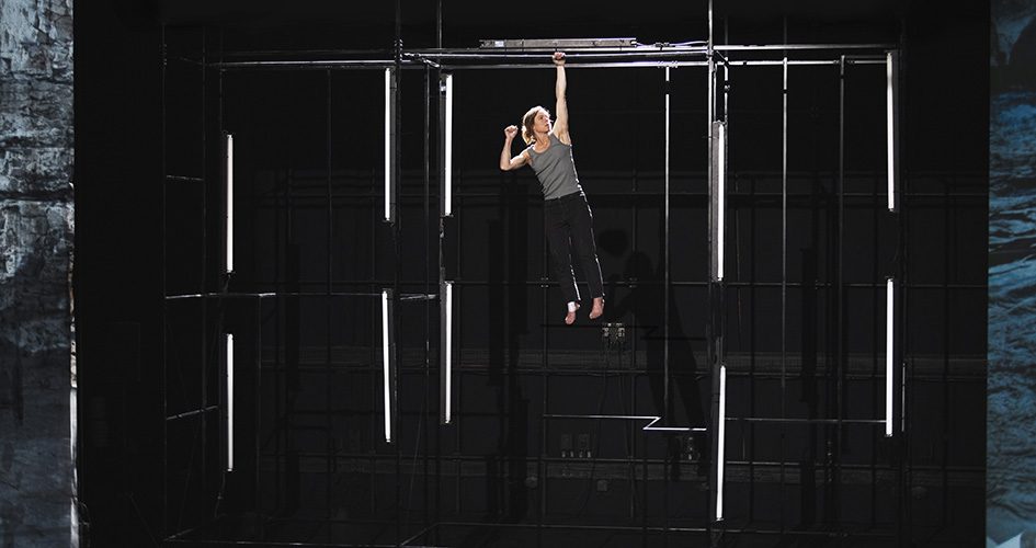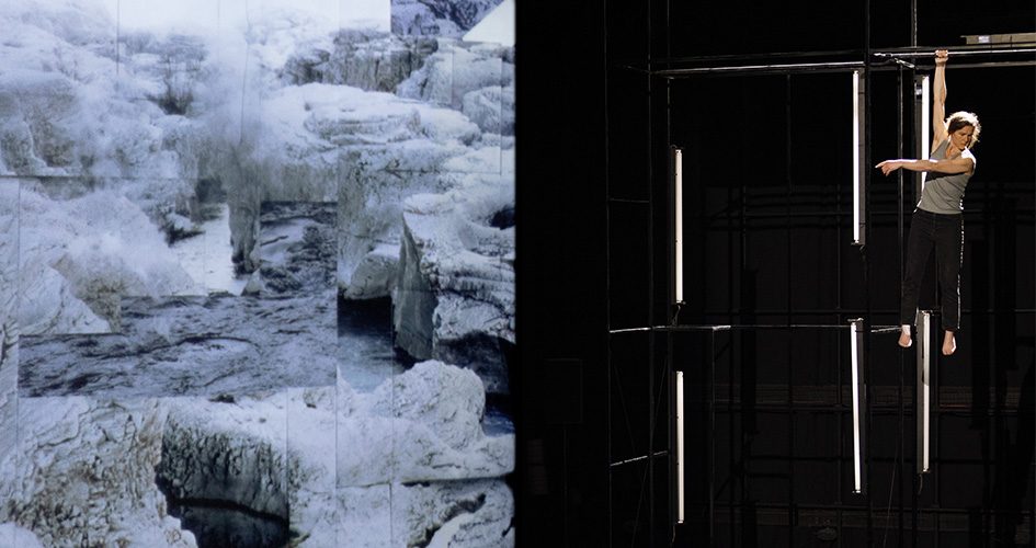 Sur trois immenses écrans, on découvre des films de Noémie Goudal et Maëlle Poésy, tournés spécialement pour cette création et inspirés de la paléo-climatologie, une discipline qui étudie les transformations de notre planète à travers les âges. On voyage à travers ces images en écoutant la musique planante de Chloé Thévenin, et l’on retient son souffle lorsqu’apparaît l’équilibriste Mathilde Van Volsem, en suspension au cœur du dispositif… Une création qui tient à la fois de la performance et de l’installation d’art contemporain !
