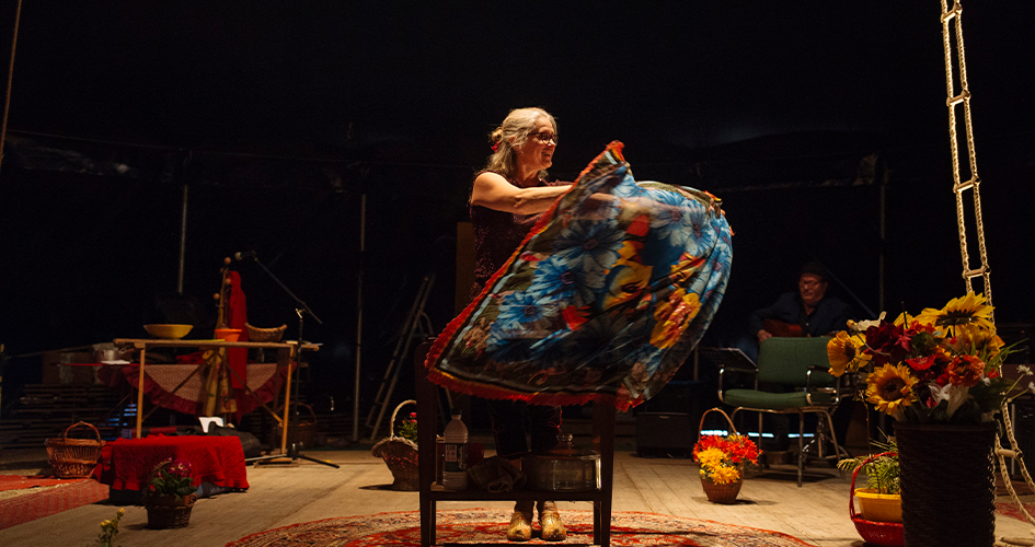 Trapéziste, elle a ensuite repris le flambeau de la compagnie avec ses frères et soeurs, avec son mari Bernard et avec leurs enfants. Sous un petit chapiteau à l’ambiance chaleureuse, son trapèze au-dessus d’elle, Sylvie se raconte : c’est quoi, une vie dédiée au cirque ? C’est comment, de passer de ville en ville, de monter le chapiteau, de jouer tous les soirs, d’élever des enfants au milieu d’un cirque ?