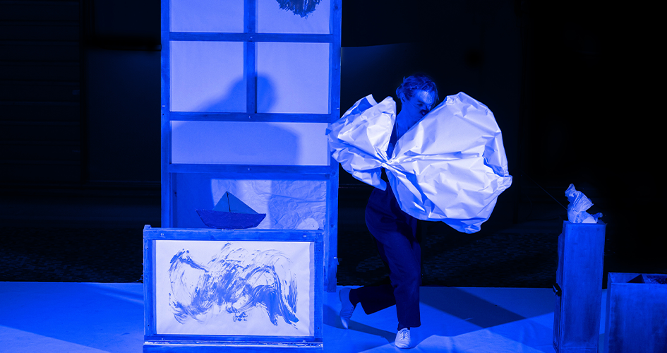 « Dans une scénographie épurée et inventive, ce spectacle explore les transformations d’une matière (le papier) et celles du personnage, qui devient démiurge de son monde. » Télérama, 2021