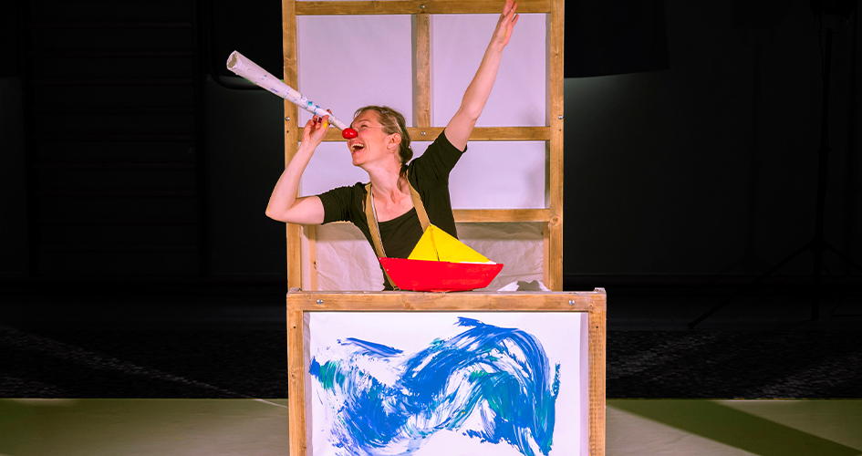Au commencement, il n’y a personne : juste une grande feuille de papier blanc sous laquelle on entend ronfler. Il est temps de se réveiller : les yeux ensommeillés, un petit être au nez rouge émerge du papier ! Interprété par la comédienne-danseuse Marion Monier, le voici qui commence à explorer le monde qui l’entoure. À la fois peureux et enthousiaste, il découvre peu à peu les couleurs, les formes et les bruits du dehors, sublimés par la musique des Quatre saisons de Vivaldi.