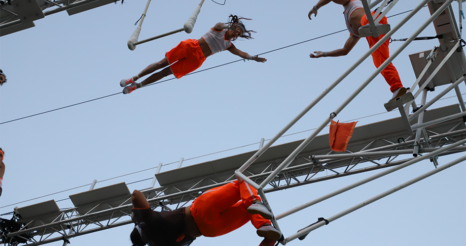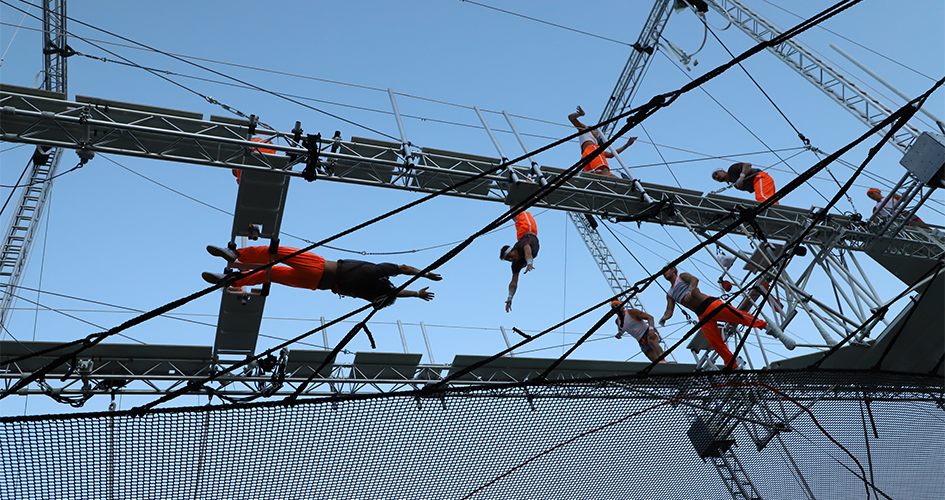 D’immenses piliers métalliques, un rectangle de pelouse, et douze athlètes en tenue de sport qui font le haka : Solstice serait-il devenu une compétition de rugby ? Coup de sifflet : des trapèzes tombent du ciel, et c’est parti pour quarante-cinq minutes d’acrobaties volantes de très haut niveau. Sur une bande son aussi endiablée que l’ambiance d’un stade surchauffé, les onze acrobates enchaînent les prouesses plus époustouflantes les unes que les autres. Avec DROP (coup de pied tombé qui permet à une équipe de gagner 3 points d’un coup), le cirque s’inspire du rugby pour créer un rituel spectaculaire et exaltant !