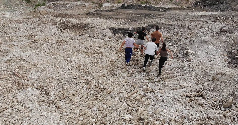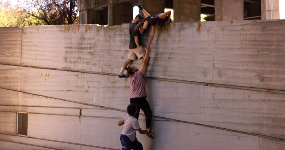 LA HORDE DANS LES PAVÉS vous guide à travers l’espace, grimpant aux murs, s’attrapant en plein vol, jouant avec les coins de rue ou d’immeuble, cherchant les points de rencontre. Le spectacle se vit autant qu’il se visite. Le jeu consiste à ne pas perdre les acrobates de vue. Ils entrainent le public avec eux dans la ville et l’invitent à ressentir l’impact d’une course.