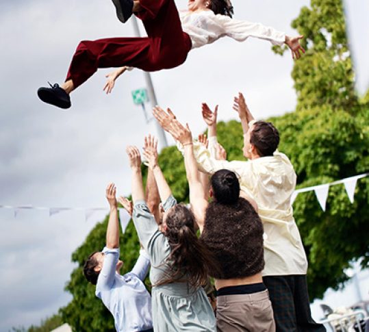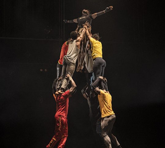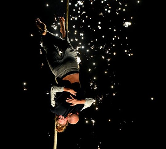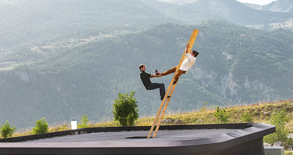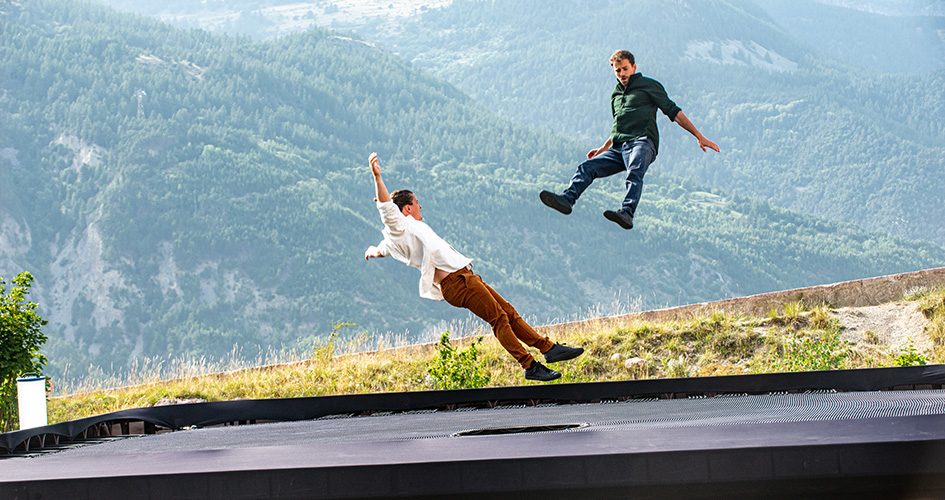 Jaillis des profondeurs, deux hommes atterrissent sur un sol-trampoline léger comme un nuage. S’aidant, se repoussant, prenant appui sur ce sol instable qui les projette très haut, ils partent à la conquête des hauteurs, dans un pas-de-deux aussi cocasse que virtuose. On est surpris, impressionné et enchanté par ces prouesses tout en légèreté et délicatesse !