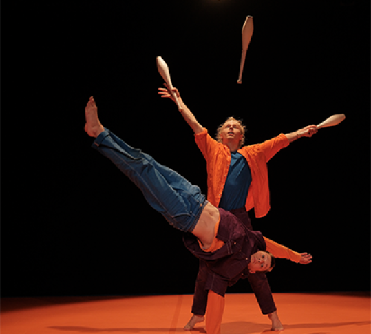 Sur un grand tapis orange, une drôle de bête multicolore se balance, s’étire et commence à bouger. Quatre bras, quatre pieds, deux têtes… C’est qu’il y a deux corps dans cette bestiole : celui de Basil, l’acrobate, et de Markus, le jongleur, qui ont fusionné pour devenir BasarKus !