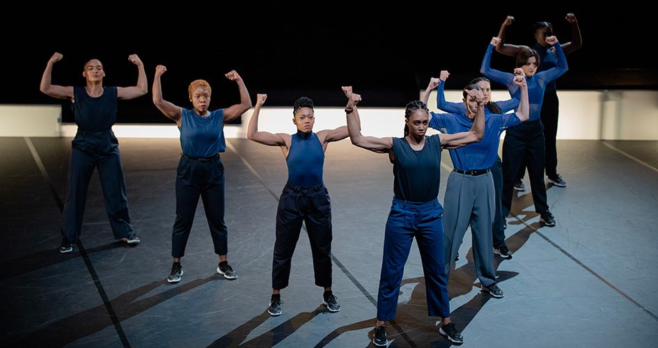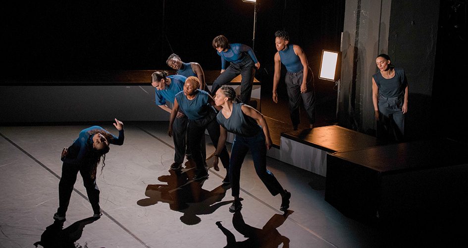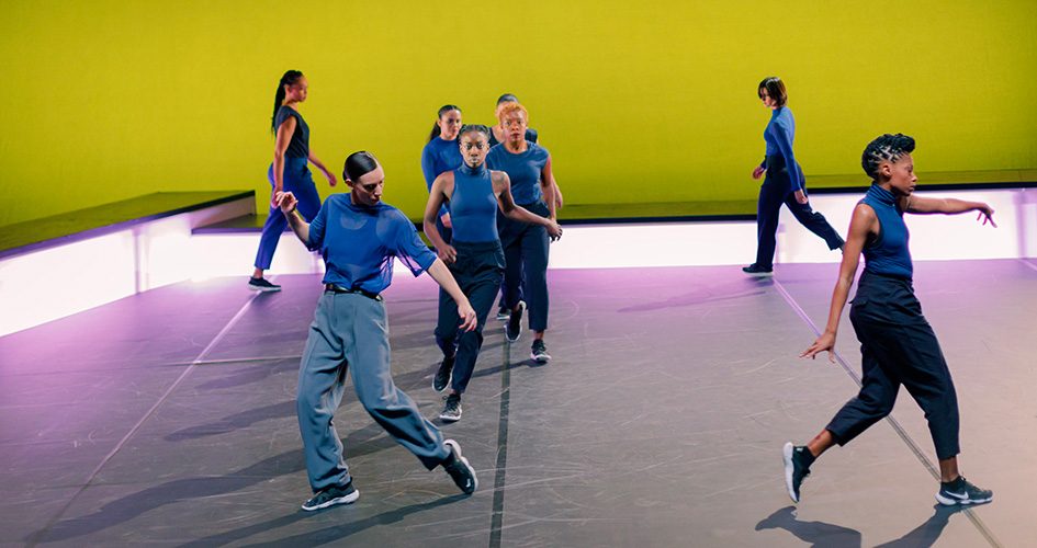 Huit danseuses vêtues de bleu s’emparent d’une scène entourée de caissons lumineux. Cinq d’entre elles sont issues du groupe Paradox-Sal, un crew 100% féminin fondé par Ousmane Sy, trois autres sont des interprètes invitées aux esthétiques variées.