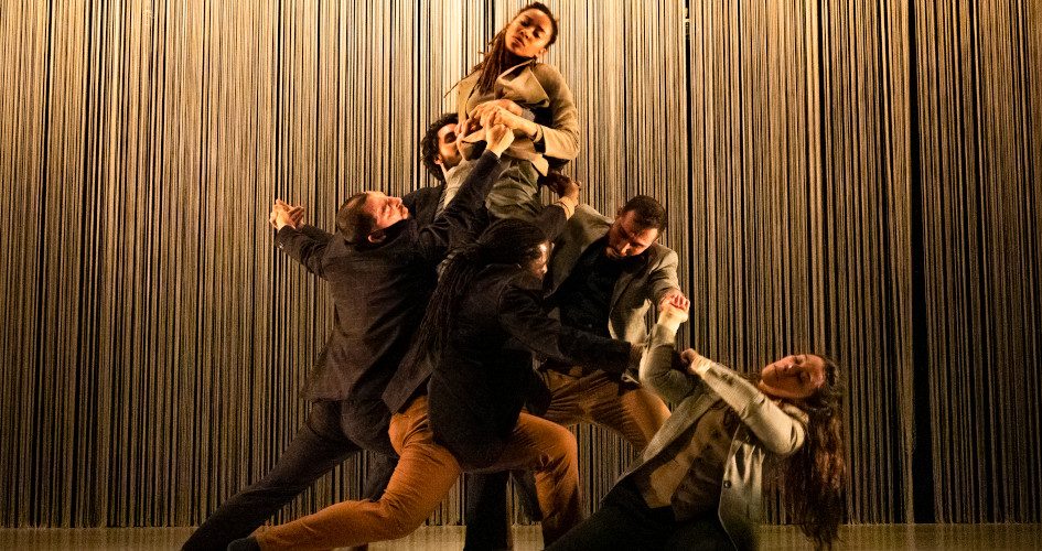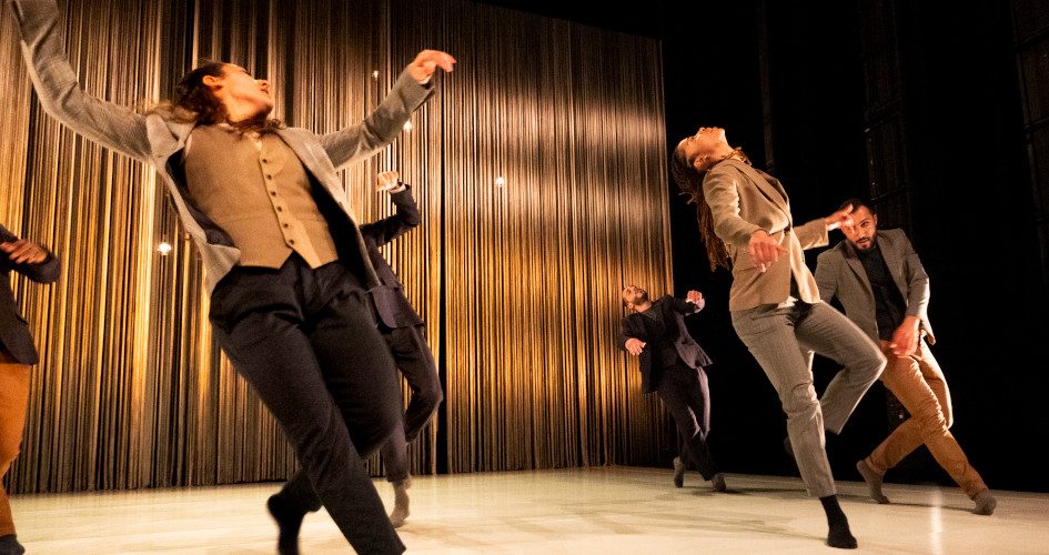 Des mots en arabe retentissent. Dos à nous, devant un superbe rideau de fils d’or, une jeune femme commence à bouger comme si ces paroles résonnaient au plus profond de son corps. Ainsi commence Oüm, une pièce qui nous emmène tout droit en Orient : accompagnés par deux musiciens, au oud et à la guitare électrique, six danseurs et danseuses prennent possession de la scène, ondulant et tournant sur eux-mêmes pour dessiner une transe collective, joyeuse et puissante.