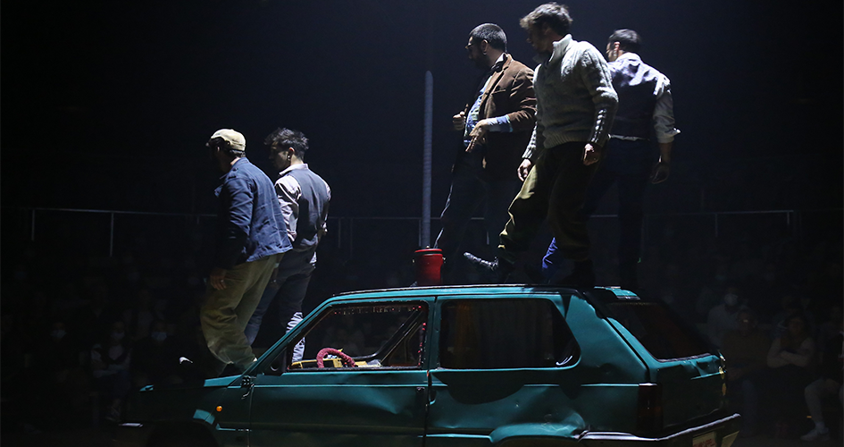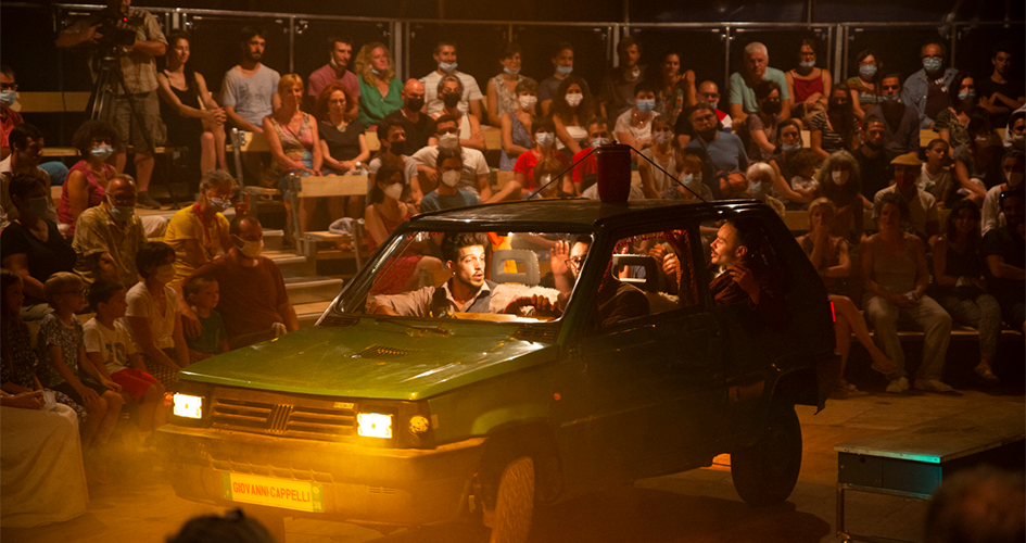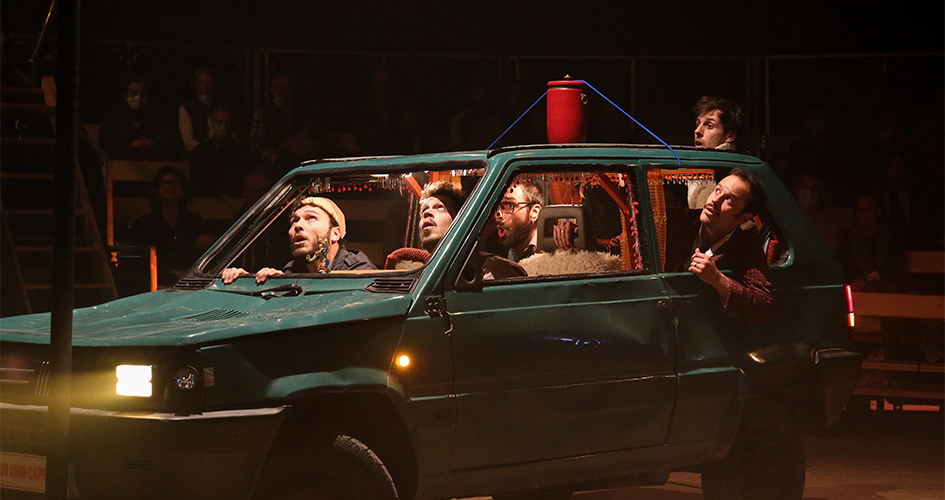 Pandax, c’est d’abord une idée comme on en a rarement vu : installer une voiture sous le chapiteau, et construire autour un scénario tissé d’acrobaties de très haut niveau ! Entassés dans une Fiat Panda vert foncé, les cinq acrobates jouent cinq frères, de retour de la crémation de leur père avec l’urne funéraire. Ils roulent (pour de vrai), ils se disputent… et les prouesses surgissent ! Portés acrobatiques, lancer de couteaux, gags divers, mât chinois, bascule : le moins que l’on puisse dire, c’est que ces cinq garçons débordent d’idées et d’énergie pour les exécuter ! Au son des chansons jazz et klezmer interprétées en direct par trois musiciennes, ils tiennent du début à la fin leur scénario, tandis que leurs corps s’envolent de plus en plus haut. Un tour de force jubilatoire !