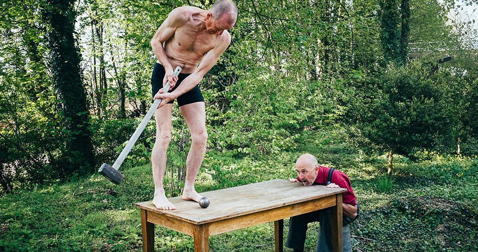 Une masse de chantier, une planche de bois, une boule de pétanque… Pour Lefeuvre et André, clowns, jongleurs et acrobates depuis plus de trente ans, tout est prétexte à l’émerveillement ! L’un en slip noir et lunettes, l’autre en pantalon large à bretelles, ils tissent avec trois fois rien un univers burlesque, poétique et volontiers absurde. Jacques Tati et Buster Keaton n’ont qu’à bien se tenir : un concentré de délicatesse et de drôlerie !