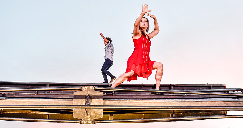 Exploits, paillettes, mots, trompettes, artifices et roulements de tambour : Viivi Roiha et Fragan Gehlker, pros de la corde aérienne, nous donnent rendez-vous autour d’un portique de 10 mètres de hauteur.