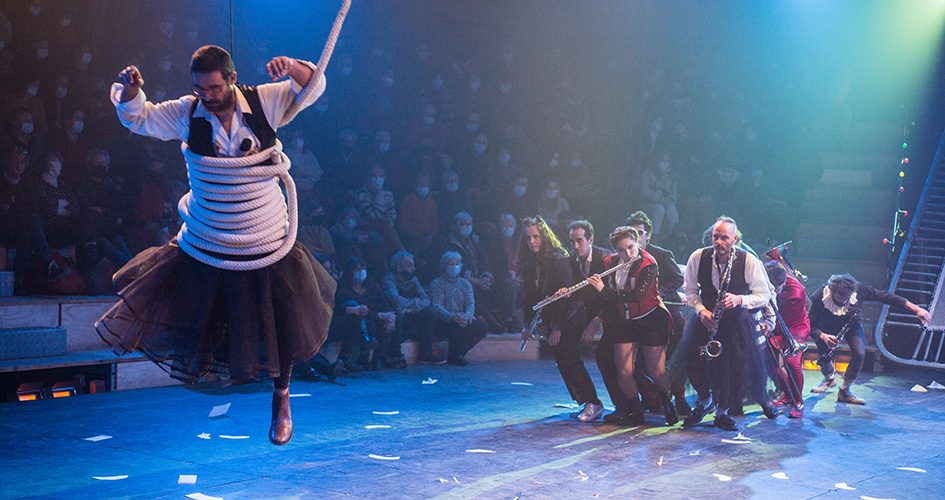 Suspendus dans les airs ou affairés autour d’un gigantesque trampoline, ces artistes de haut vol nous mettent volontiers à profit pour construire des tableaux époustouflants ou des instants de pure poésie. Un spectacle qui nous enivre à chaque instant !