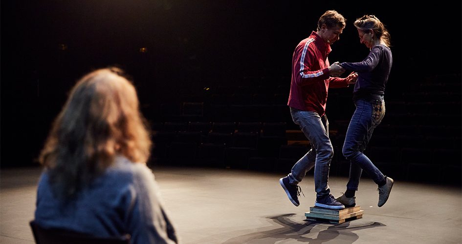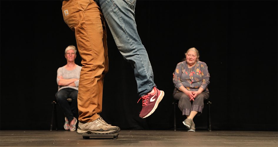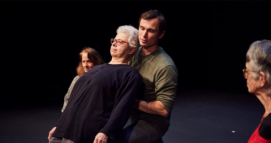 D’abord on regarde des images-vidéos, celles d’acrobates à l’entraînement mêlées à celles de personnes en EHPAD, qui tentent de conserver leur mobilité. Puis, on découvre les héroïnes de la soirée : cinq femmes de quatre-vingt-et-quelques printemps, prêtes à s’essayer aux portés acrobatiques avec le porteur Alexandre Fray. Enfin, on entend des voix, celles de femmes âgées qui partagent avec nous leur chemin de vie.
