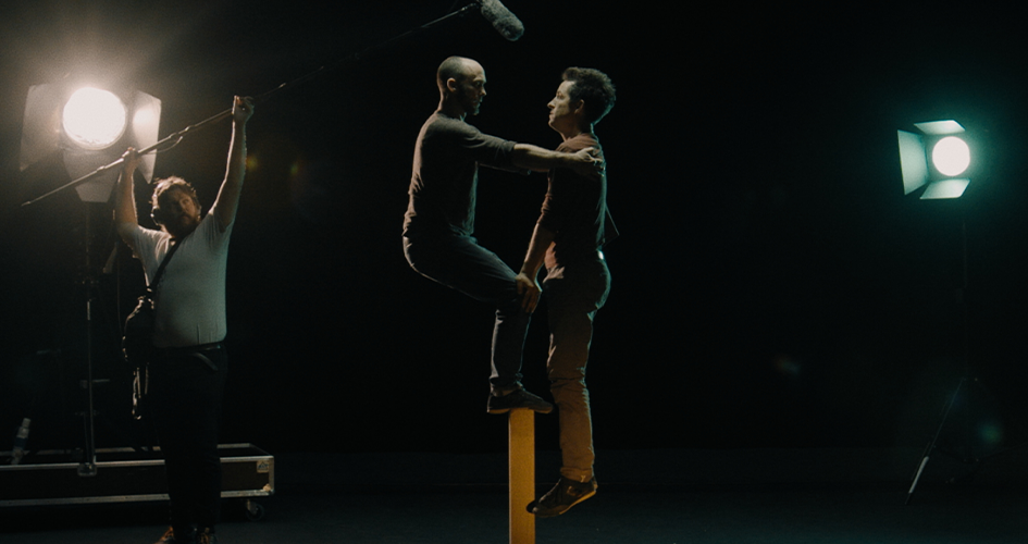 Perchés sur une poutre trop petite pour pouvoir tous les deux y poser les pieds, deux hommes discutent tout bas. Tandis que le tour de force s’installe, plus inouï à mesure que les minutes passent, un ingénieur du son à l’esprit malicieux débarque pour nous faire entendre ce que les acrobates se disent. On s’esclaffe du décalage entre les sujets de conversation et les corps en tension, et on se laisse charmer par cette proposition délicieusement absurde.