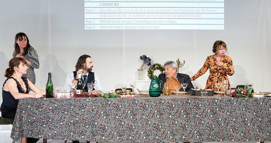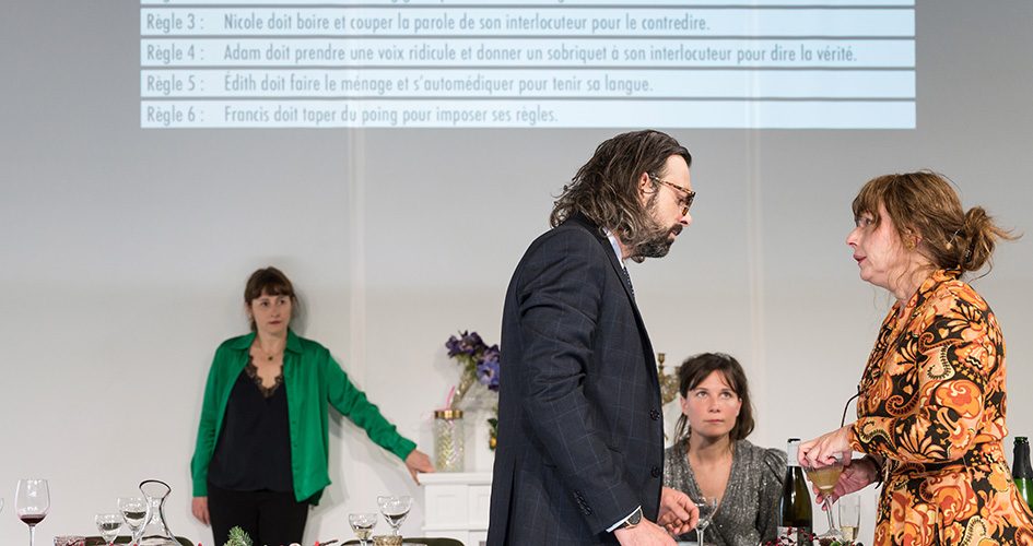 Rules for living est une pièce de Sam Holcroft, la nouvelle coqueluche du théâtre britannique. À chaque début de scène, on découvre les règles du jeu des personnages, connues uniquement du public : Matthew, le fils avocat, ment dès qu’il est assis ; Nicole la belle-fille, doit boire à chaque fois qu’elle veut contredire quelqu’un, etc. Le tout donne un spectacle jouissif pour les spectateurs mis dans la confidence ! Caustique et jubilatoire, Rules for living se distingue pour ses scènes d’anthologie et son portrait sans concession d’une société patriarcale à bout de souffle.