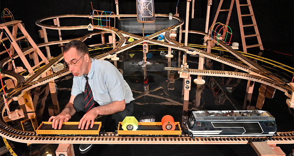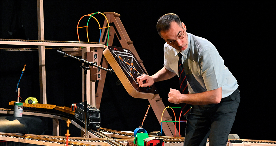Que l’on ait 3, 33 ou 63 ans, on retrouve notre âme d’enfant dès l’entrée dans la salle : devant nous se tient un circuit de train géant, avec ses passages à niveau, ses aiguillages, ses tunnels et ses ponts ! Cravate autour du cou, un pro du beatbox lance une première locomotive. Puis une seconde, et bientôt une troisième : grâce à un ingénieux système d’objets connectés, il donne à chacune son rythme, son sifflement ou son chuintement. On ouvre grand les yeux et les oreilles pour ne rien manquer de cette symphonie ferroviaire d’une extraordinaire fluidité !