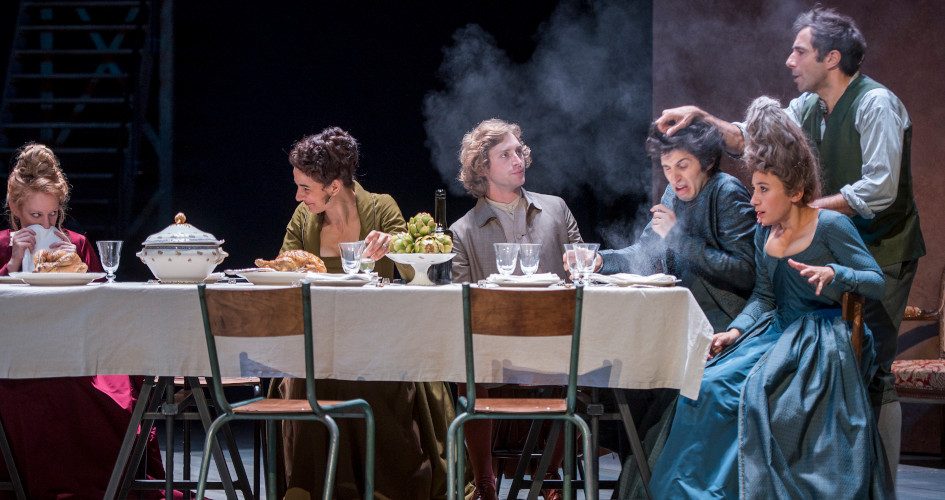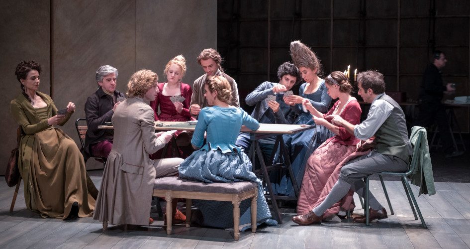 Sociétaire de la Comédie-Française, Clément Hervieu- Léger met en scène cette pièce peu connue de Carlo Goldoni (1707-1793), père de la comédie italienne moderne, avec une étincelante virtuosité. Dans un décor de tréteaux de bois, douze comédiens vêtus de costumes d’époque aux couleurs chatoyantes virevoltent avec entrain. Ils mangent, ils jouent aux cartes, ils chantent, ils dansent… et nous, on a l’impression de faire partie de la fête : un enchantement de tous les instants !