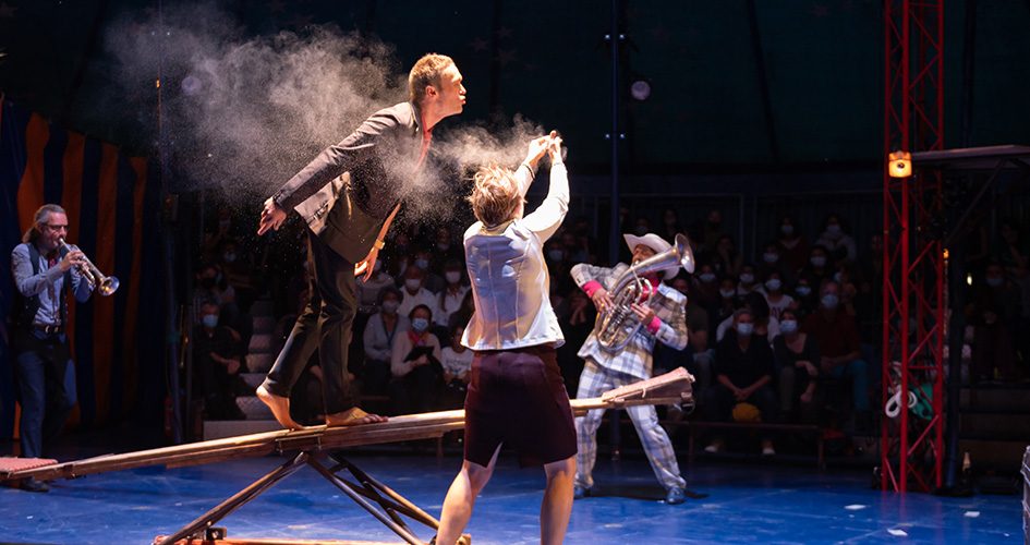 La spécialité de ces artistes, en plus de la musique, c’est le cirque, mention trapèze et vélo acrobatique. D’une scène à une autre, ils campent toute une galerie de personnage pour mieux croquer des moments de vie, et enchaînent les figures, les portés et les mélodies avec une joie communicative. Du cirque festif, musical et collectif !