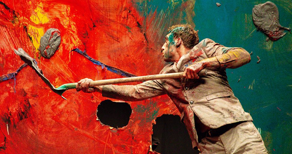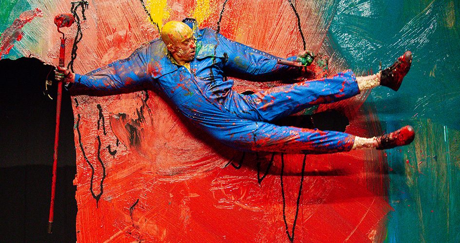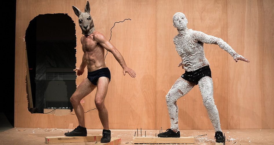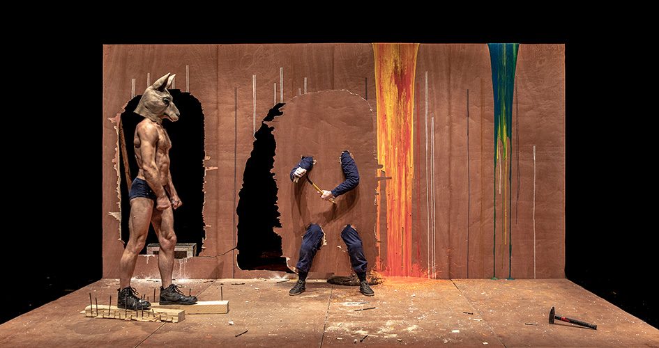 Des clous, du bois, de la peinture, quelques outils : en apparence, c’est un atelier de bricolage tout à fait normal qui s’est installé sur la scène. Sauf que les interprètes munis de masques ou recouverts de plâtre, ils s’engagent dans une performance qui tourne vite au délire de cirque mêlé d’arts plastiques !