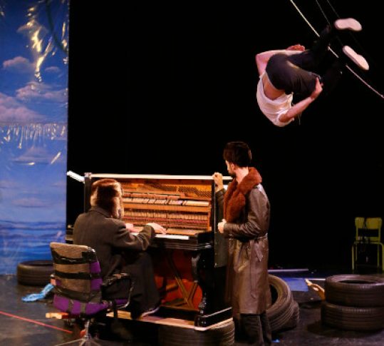 Au commencement, sur scène, il y a Adam et Ève sous les traits d’un couple d’acrobates. Porté acrobatique, salto… tout est simple, harmonieux, évident. Lorsqu’un bonbon apparaît sur le sol, Adam et Ève le mangent, et cherchent une poubelle pour jeter le papier. Mais dans cette poubelle dort un vieux barbu aux allures de clochard, mi-Dieu mi-clown…