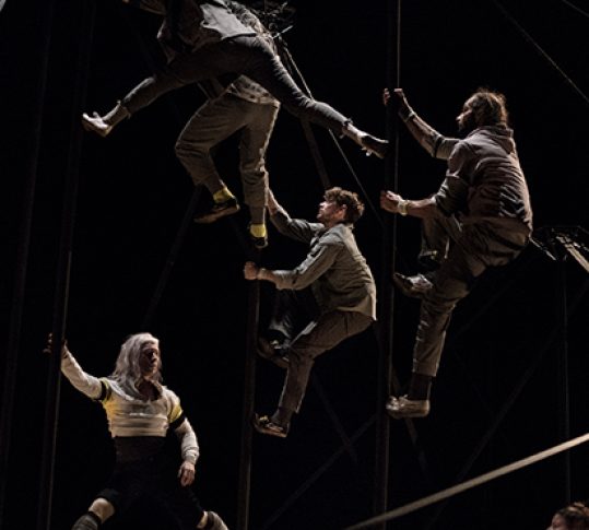 Sept mâts de différentes hauteurs s’élèvent vers le ciel : en costumes gris à bandes jaunes, un collectif d’acrobates va y monter pour vous épater ! Grimpant, glissant ou sautant d’un mât à un autre, ces sept-là s’élancent dans toutes les directions et inventent des figures de groupe inédites.