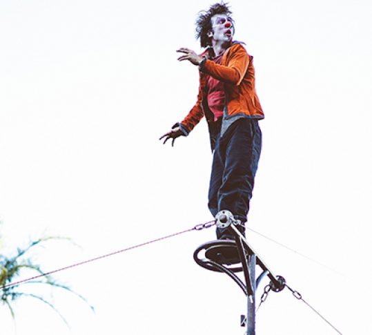 Un clown déboule de nulle part et s’approche de nous. Très agité, presque survolté, il parle, parle, parle… et s’étonne de tout : mais que veut-il nous dire au juste ? C’est tout en haut d’un très grand mât qu’il va aller chercher des réponses à ses questions existentielles… au risque de devoir lâcher et tout recommencer !