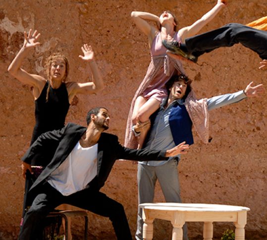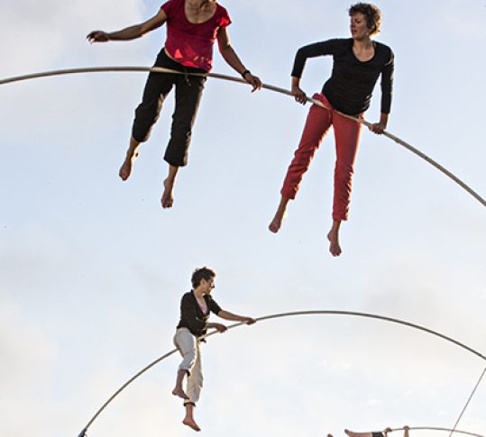 Venus de France et du Maroc, trois hommes et deux femmes sont réunis autour d’un grand échafaudage. Spécialistes de trapèze, des sangles ou du parkour, ils explorent toutes les possibilités de cette structure précaire !