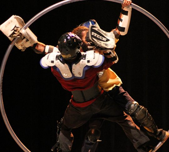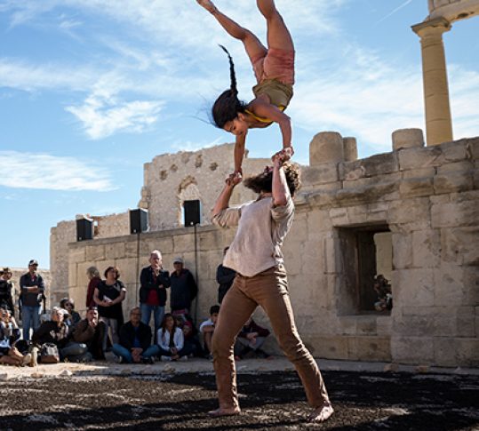 Une voltigeuse et un porteur font naître de l’enchevêtrement de leurs corps toute une série de mystérieuses créatures. Perchés l’un sur l’autre ou étroitement imbriqués, ils rampent, galopent, s’affrontent, et nous entraînent dans un duo acrobatique librement inspiré de la nature !