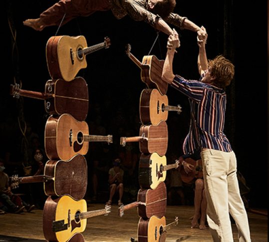 Quatre garçons et une fille entrent en piste et tentent de tenir debout sur une guitare. Car ces « dodos » sont de drôles d’oiseaux aux talents singuliers : acrobates autant que musiciens, ils utilisent leurs instruments pour faire de la musique, mais aussi comme partenaires d’acrobaties spectaculaires !