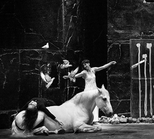 De hauts murs, sombres et mystérieux : voilà un décor monumental propice aux apparitions ! Un cheval traverse, des pigeons s’envolent, une mariée tente de garder l’équilibre : déboulant de partout, humains et animaux s’emploient à vivre dans cet univers rock où se mêlent acrobaties, danse et clown, chant lyrique et guitares rock.