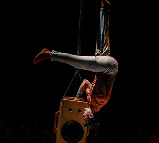 Agile et bourré d’idées, un danseur-acrobate construit un monde de sons avec les mouvements de son corps. Assis tout autour de lui, équipés de petits sacs à dos mystérieux, c’est tout un univers qui s’offre à nous : nos oreilles reconnaissent le ronronnement d’un chat, le vrombissement d’une abeille, et notre imagination fait le reste !