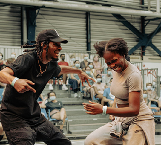 Venus de tous les horizons, des danseurs réunis en équipes s’affrontent pour inventer en direct des chorégraphies originales sur les sons house d’un DJ ! Assis en cercle autour d’eux, on se laisse séduire par leur énergie et leur réactivité… et surtout on vit un grand moment de fête, de rencontre et d’échange !
