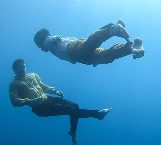 Le terrain de jeu de Frédéri et Sébastien, d’ordinaire, c’est la terre : grands et élancés, ces deux acrobates sont des porteurs expérimentés. Ce sont aussi des spécialistes d’apnée, capables de rester plus de quatre minutes sous l’eau.