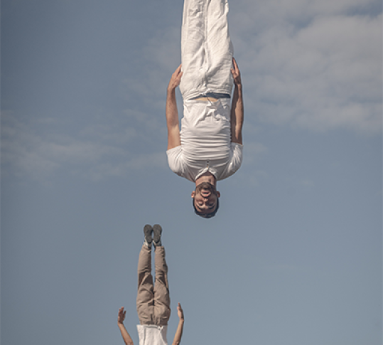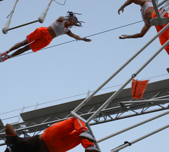 Pour Envol, huit acrobates et gymnastes, spécialistes du trampoline ont construit un terrain de jeu propice à toutes les folies. Ici, on rebondit de partout : au centre, sur les côtés, à la verticale et bien sûr le plus haut possible !