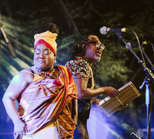 Le bal de Solstice se met aux couleurs du maloya, genre musical traditionnel de l’Île de la Réunion ! Avec Votia, un groupe emmené par la voix puissante de Marie-Claude Philéas Lambert, fille du grand musicien Granmoun Lélé, on se déhanche au rythme des percussions et des polyphonies. Solaire et généreux !